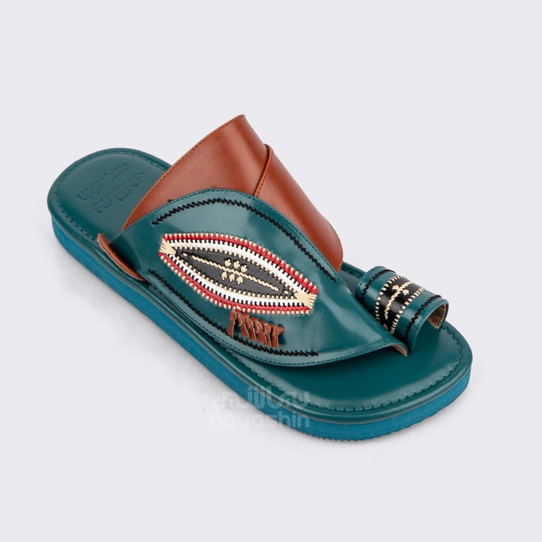 نعال زبيري مطرز جلد طبيعي فيروزي وجملي