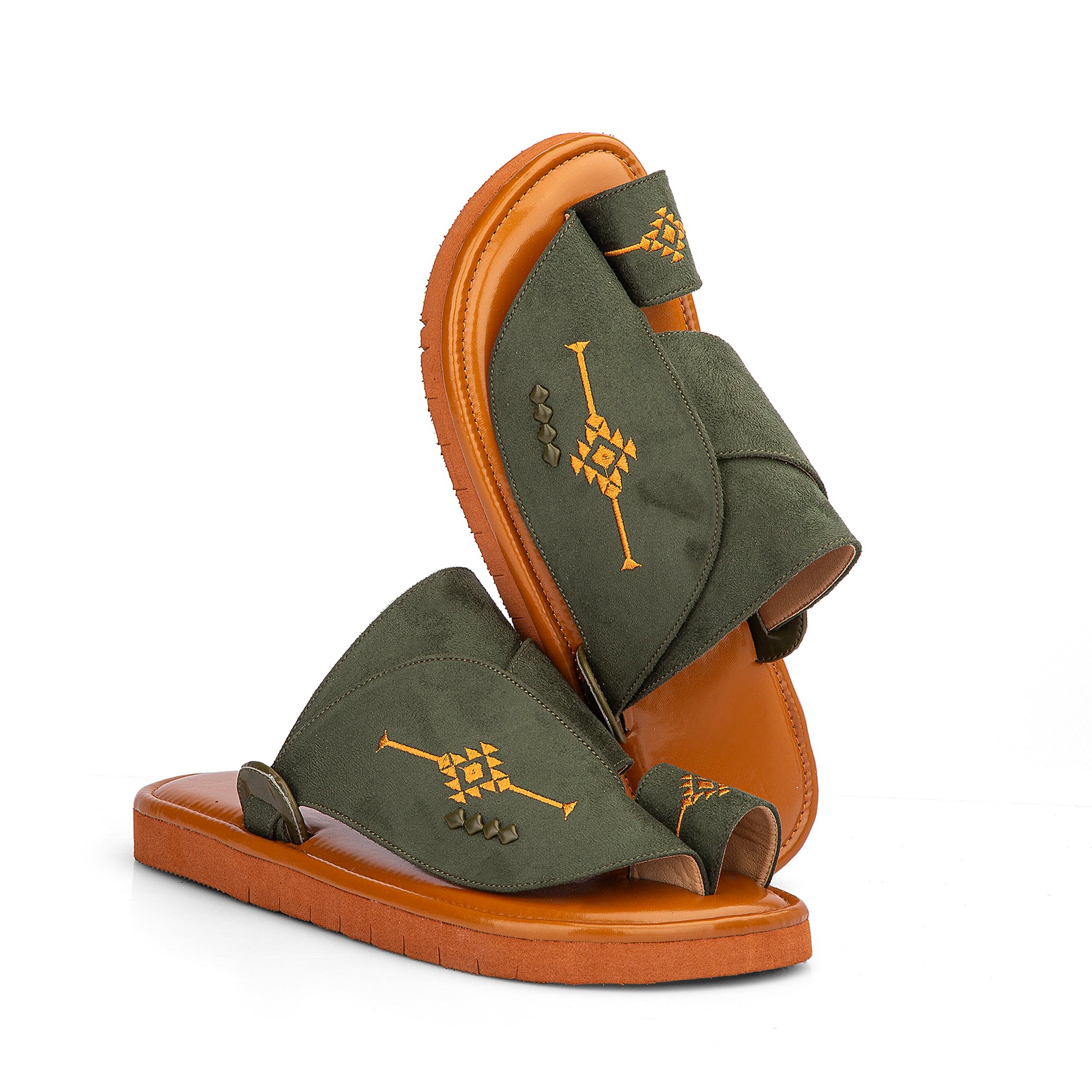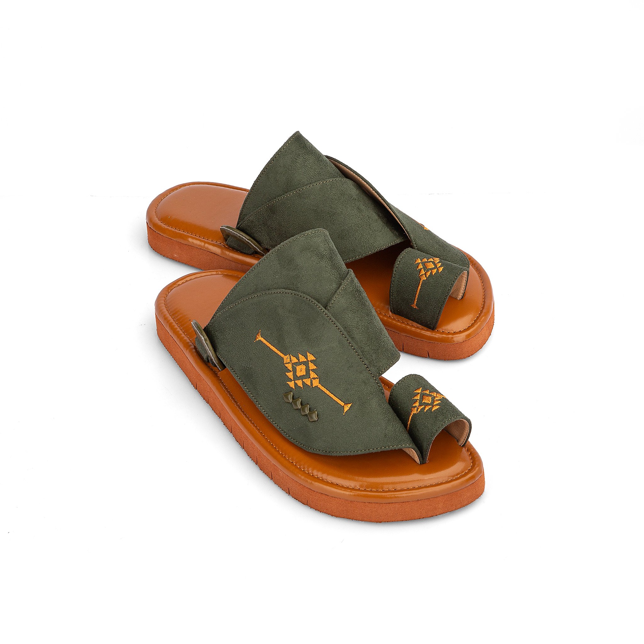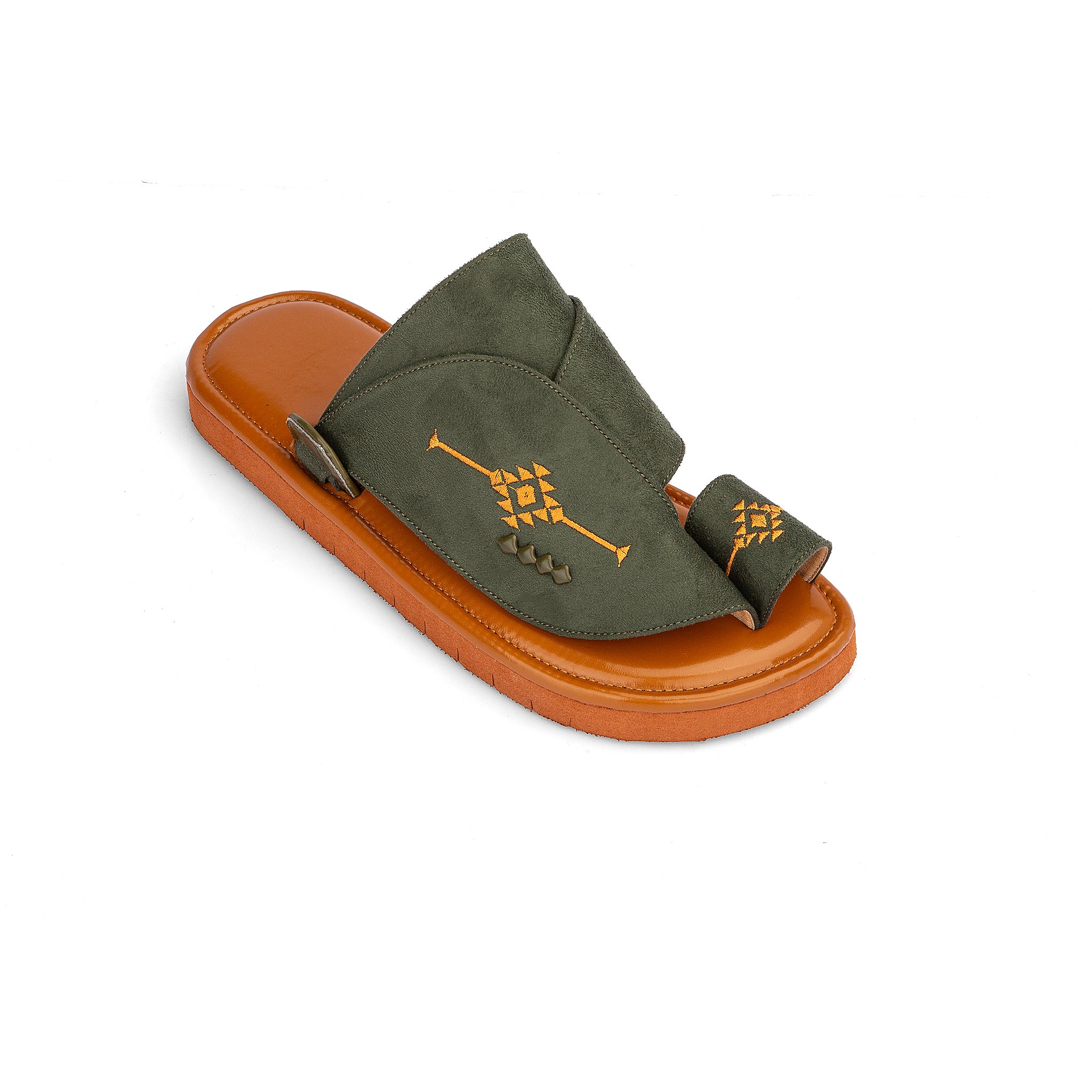 نعال شرقي شمواه زيتي مطرز بنعل جملي طبي، قطعة تجمع بين "راحة القدم" و"تفاخر العين"! تخيل أنك ترتدي شيئاً يشبه السحابة تحت قدميك، لكنه في نفس الوقت يجعل الناس يتوقفون ليقولوا: "وااااو، هذا الحذاء!"